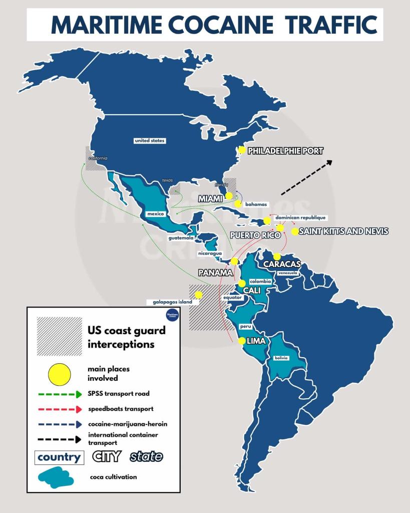 Colombia, Peru and Bolivia are transported by river and/or land to the main shipping ports. Cali (Colombia), Lima (Peru), Panama and Caracas (Venezuela). The route then continues on to Puerto Rico, Saint Kitts and Nevis, the Bahamas and the Dominican Republic.
